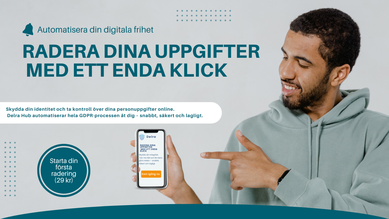 Delra skickar automatiska GDPR-begäranden till sajter som Ratsit, Merinfo och Hitta.se – du får PDF-kopia direkt i din e-post.